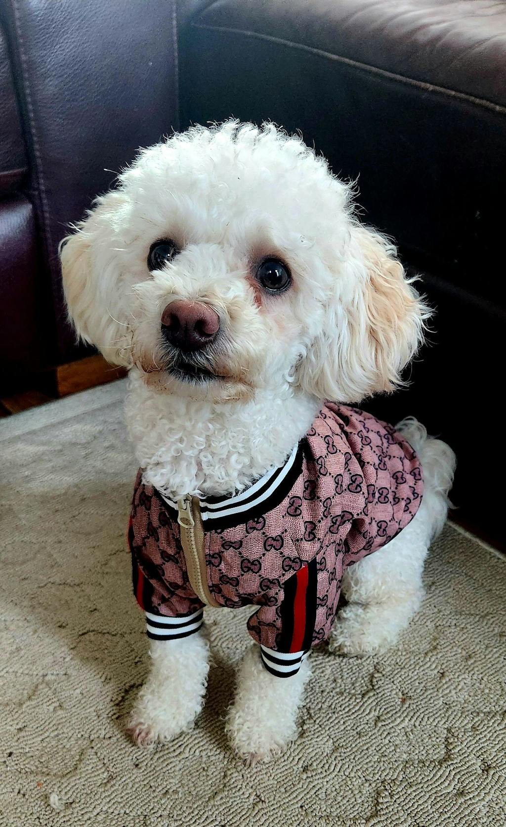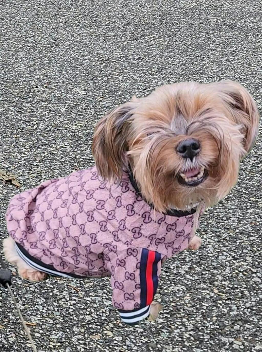For the pup that moves with style, the Trackline Heritage Jacket is a bold blend of classic luxury and athletic edge. Crafted from premium monogram-print fabric, this zip-up jacket showcases iconic striped detailing on the sleeves, adding a touch of vintage sportswear charm. Ribbed cuffs and hem provide a tailored fit, while the gold-tone zipper ensures easy wearability. Whether strutting through city streets or lounging in high fashion, this piece is designed for pets who lead the pack.