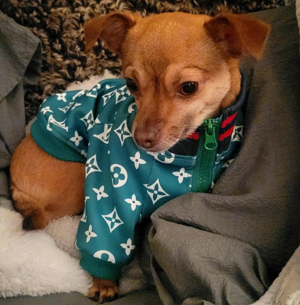 The Emerald Avenue Bomber delivers bold luxury with a vibrant green monogram canvas and sporty stripe collar. Designed with a zip-front closure for effortless wear, it blends streetwear flair with a polished silhouette, making it perfect for pets who love to stand out in style during every outing.
