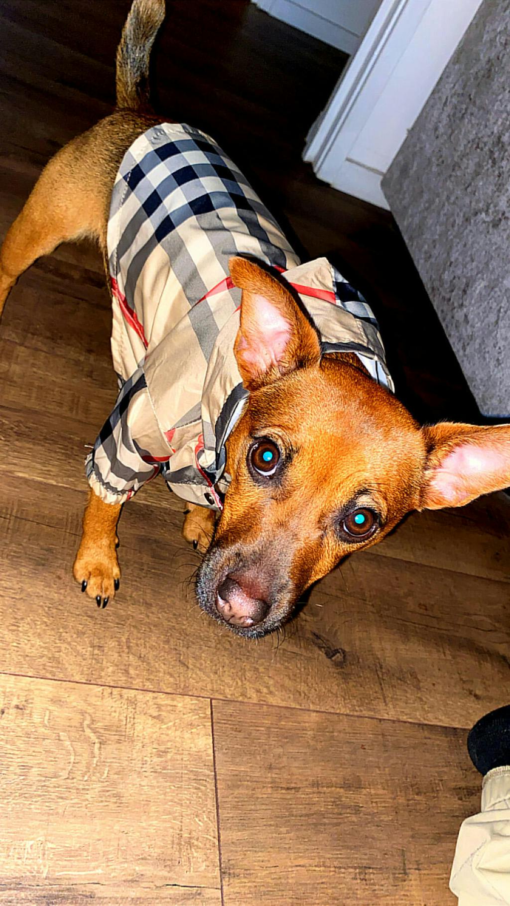 The Kensington Rain Guard brings timeless British elegance to rainy-day walks. Featuring a check pattern in warm beige, black, and red, this lightweight hooded coat keeps your pet dry while turning the sidewalk into their personal runway. Practical yet polished, it’s the ultimate blend of function and fashion.