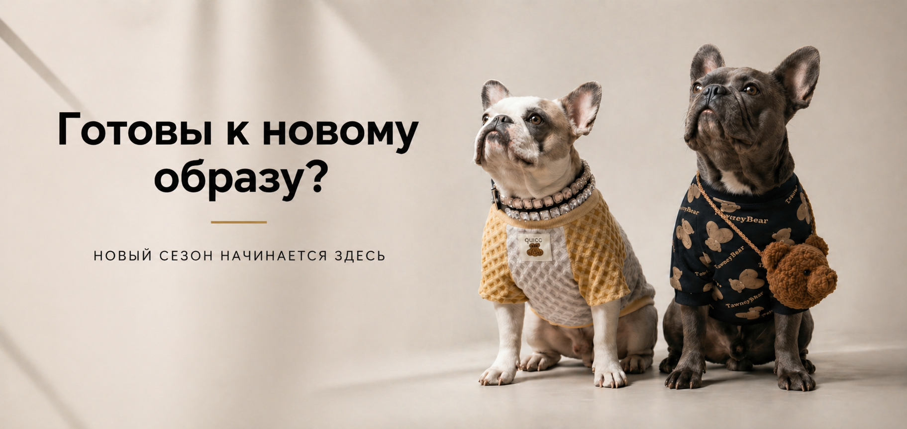 Dog wearing a black and white dress with heart patterns on a beige background